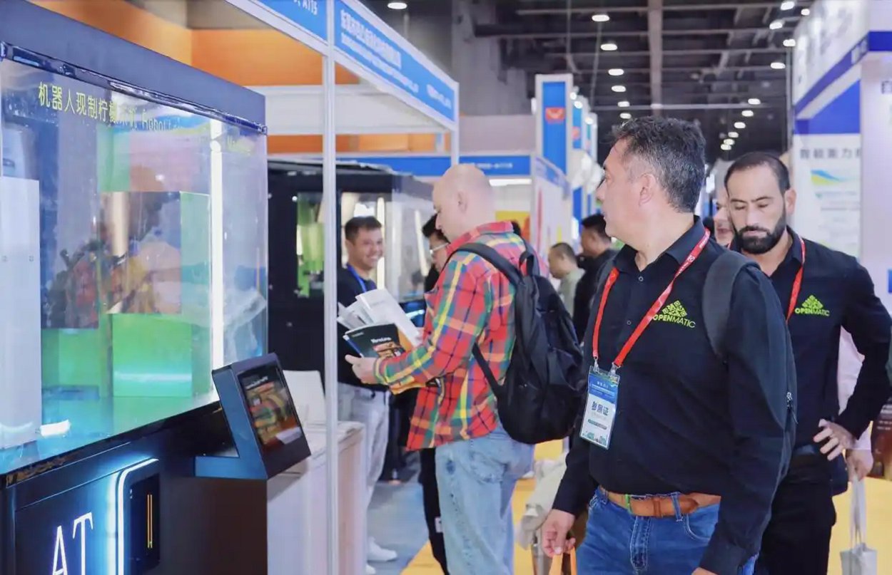 展馆内人潮涌动,洽谈互动画面随处可见。外国采购商体验能制作现磨咖啡的机器人售货机;戴着智能眼镜的观众伸手“抓取”虚拟商品;装载着自动售货机的无人机正在进行配送演示……